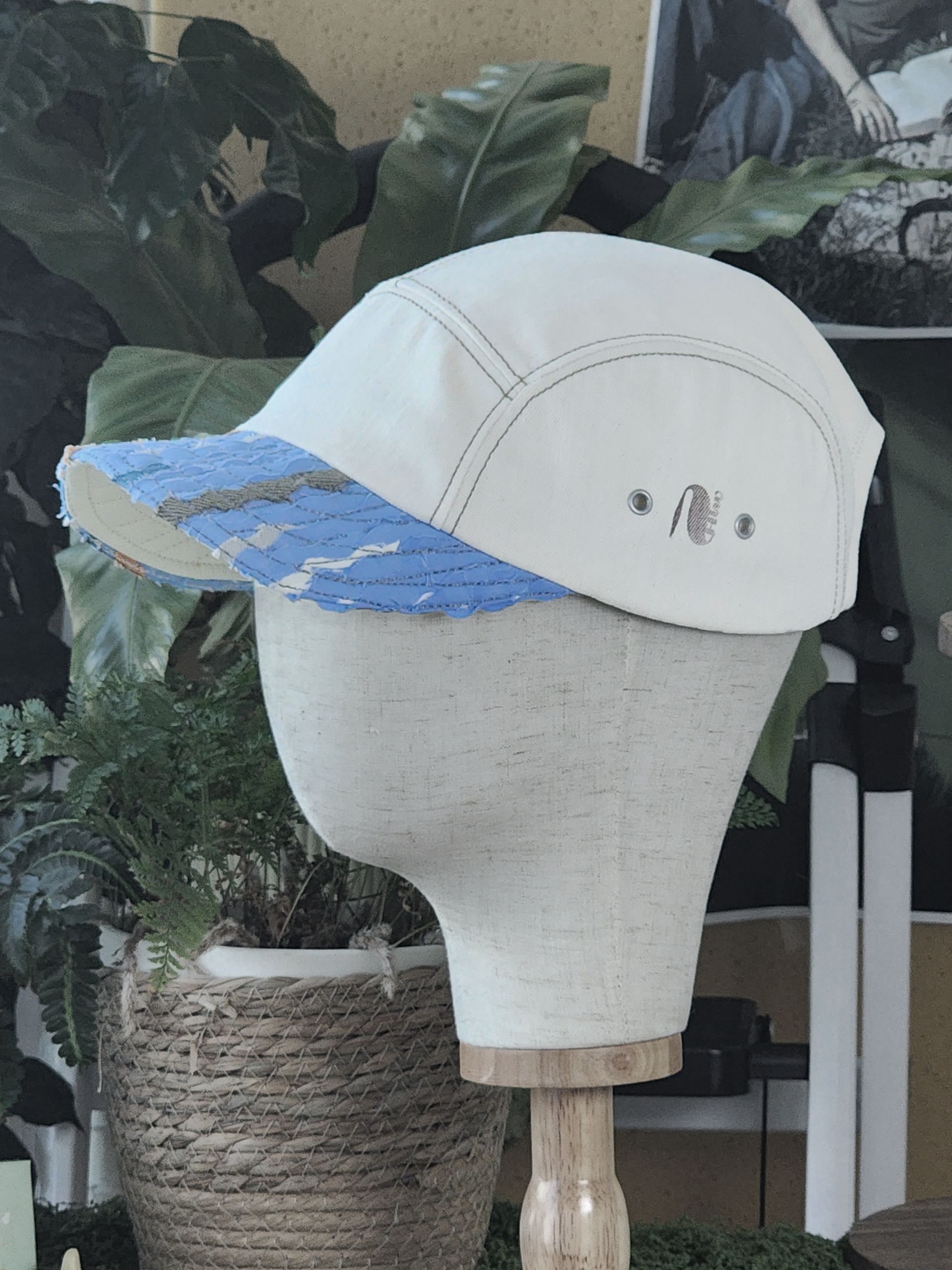 이 모자는 방치된 옷이나 오래된 원단에서 얻은 천 조각들을 겹겹이 쌓고 꿰매어, 하나의 풍경처럼, 하나의 장면처럼 표현하는 흘로만의 독자적인 직조적 기법인 '우브그로(Wovegrow)' 기법으로 제작되었습니다.