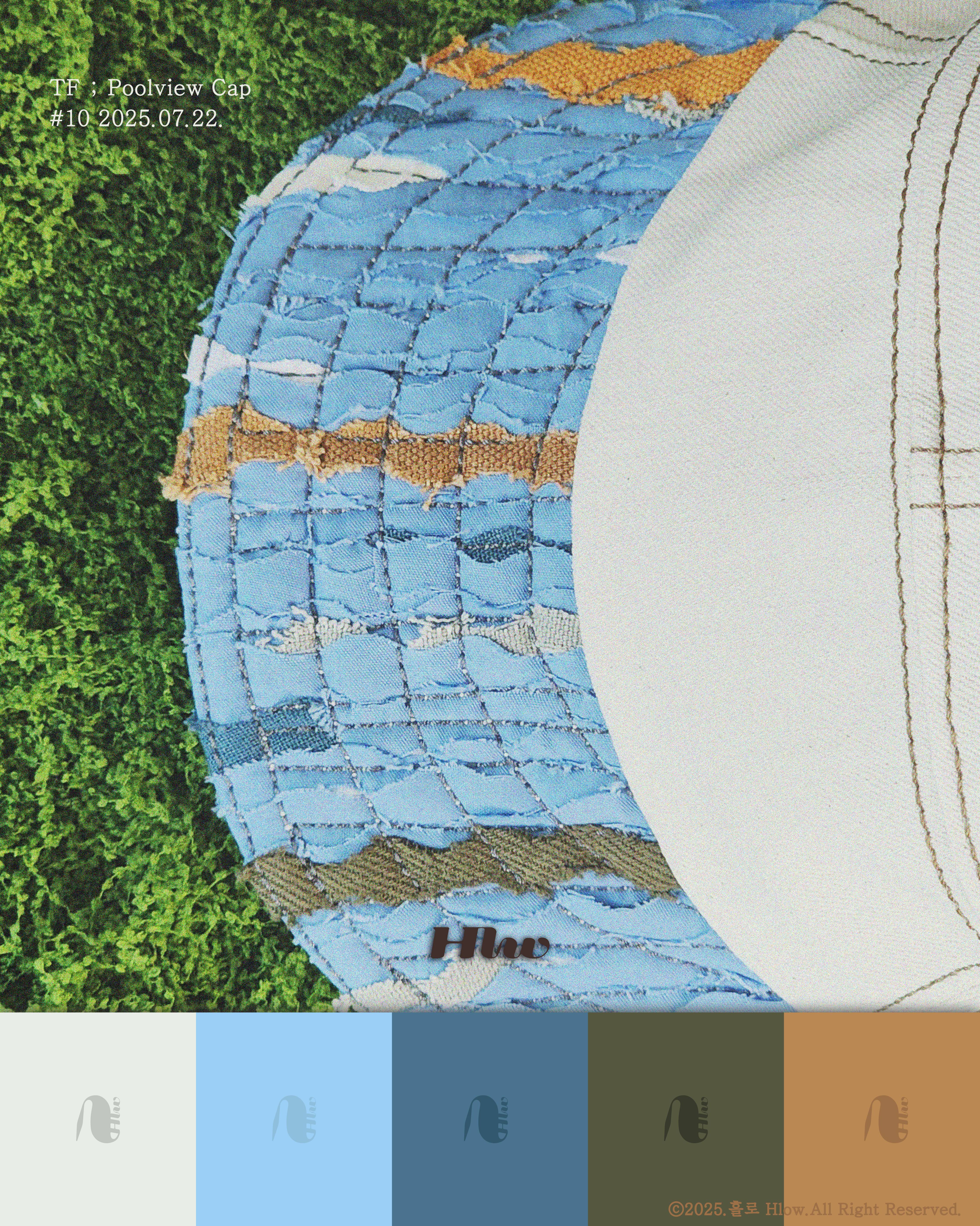 캡에는 해체된 의류에서 얻은 다양한 재질의 원단을 겹쳐 수영장을 위에서 내려다본 모습을 표현했습니다. 물결처럼 유기적으로 흐르는 곡선의 합은 여름의 한 장면을 은유적으로 떠올리게 합니다. 흘로는 이 모자를 통해 시간이 남긴 흔적들을 새로운 시선으로 바라보며, 원단의 잠재력을 다시 피워냅니다.