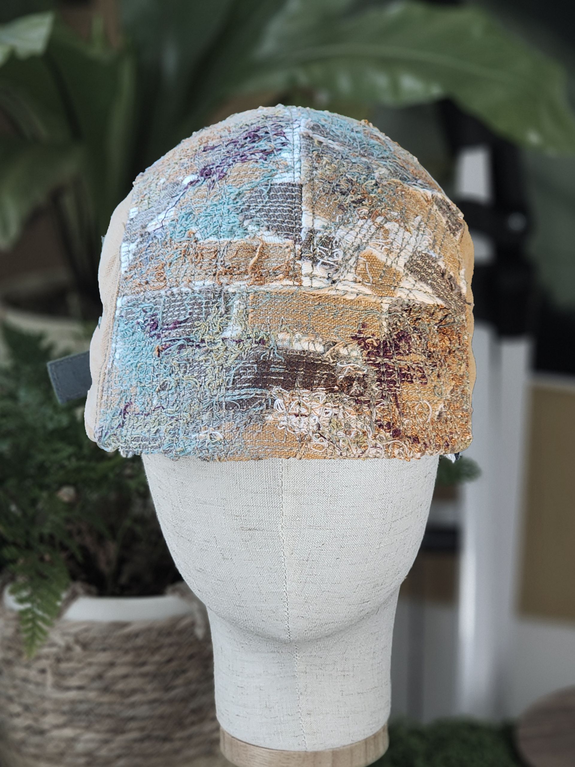 This skull cap is crafted based on Hlow's experimental textile technique.