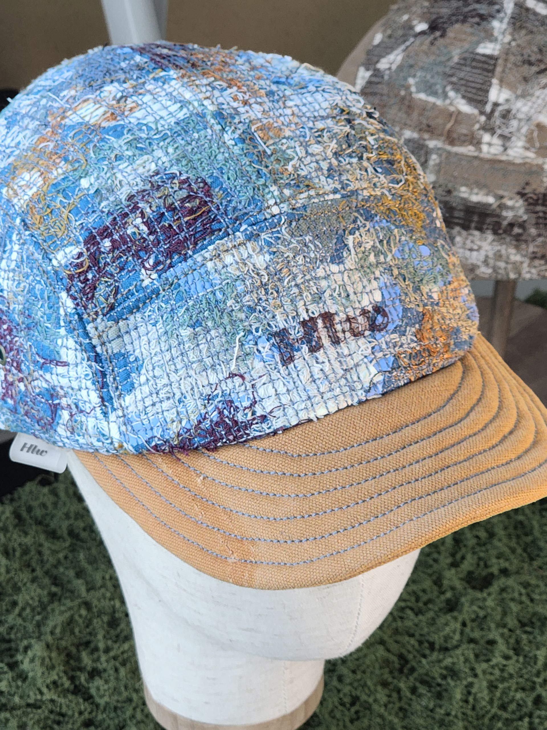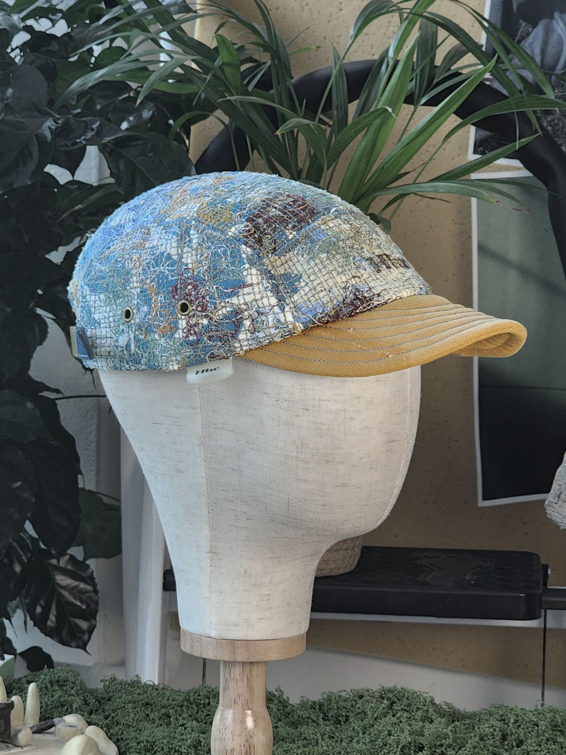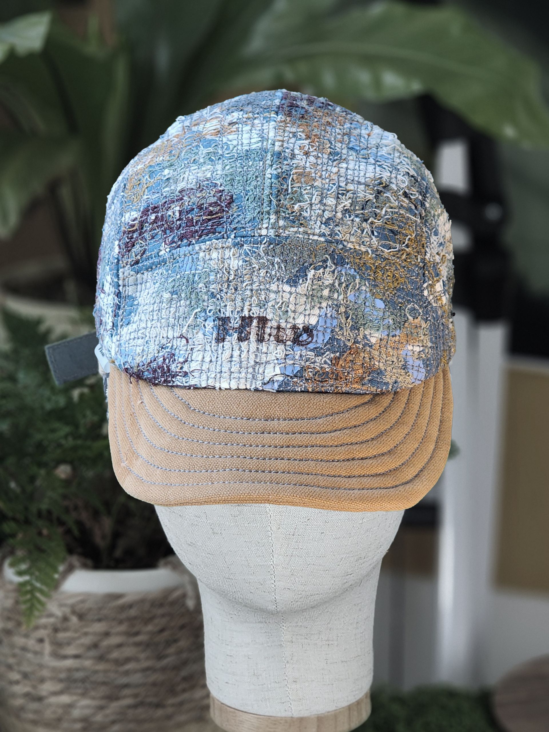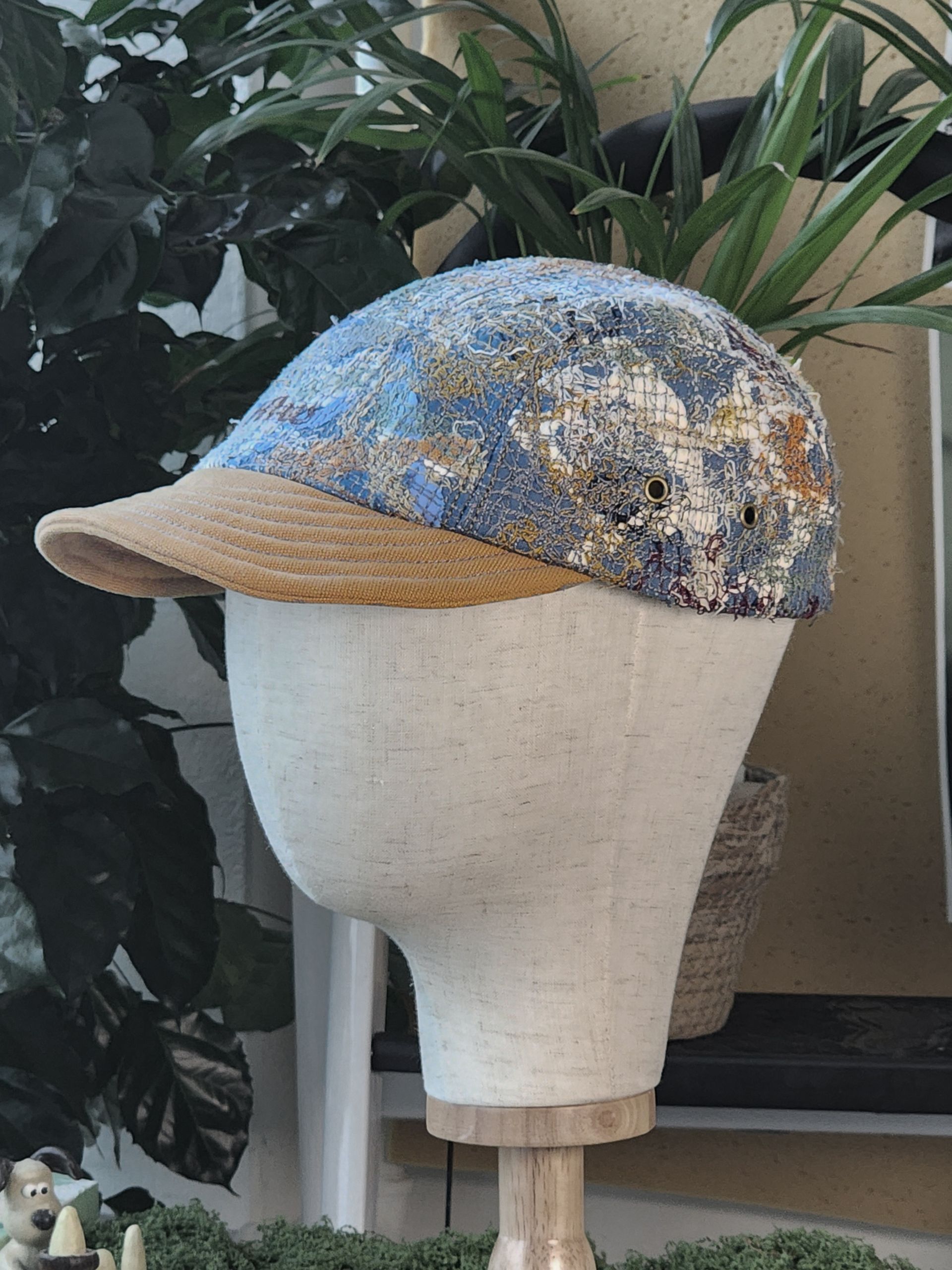 This cap captures the layered hues of the deep ocean and the shifting borders of broken waves by arranging blue-toned fabric scraps on a white base.