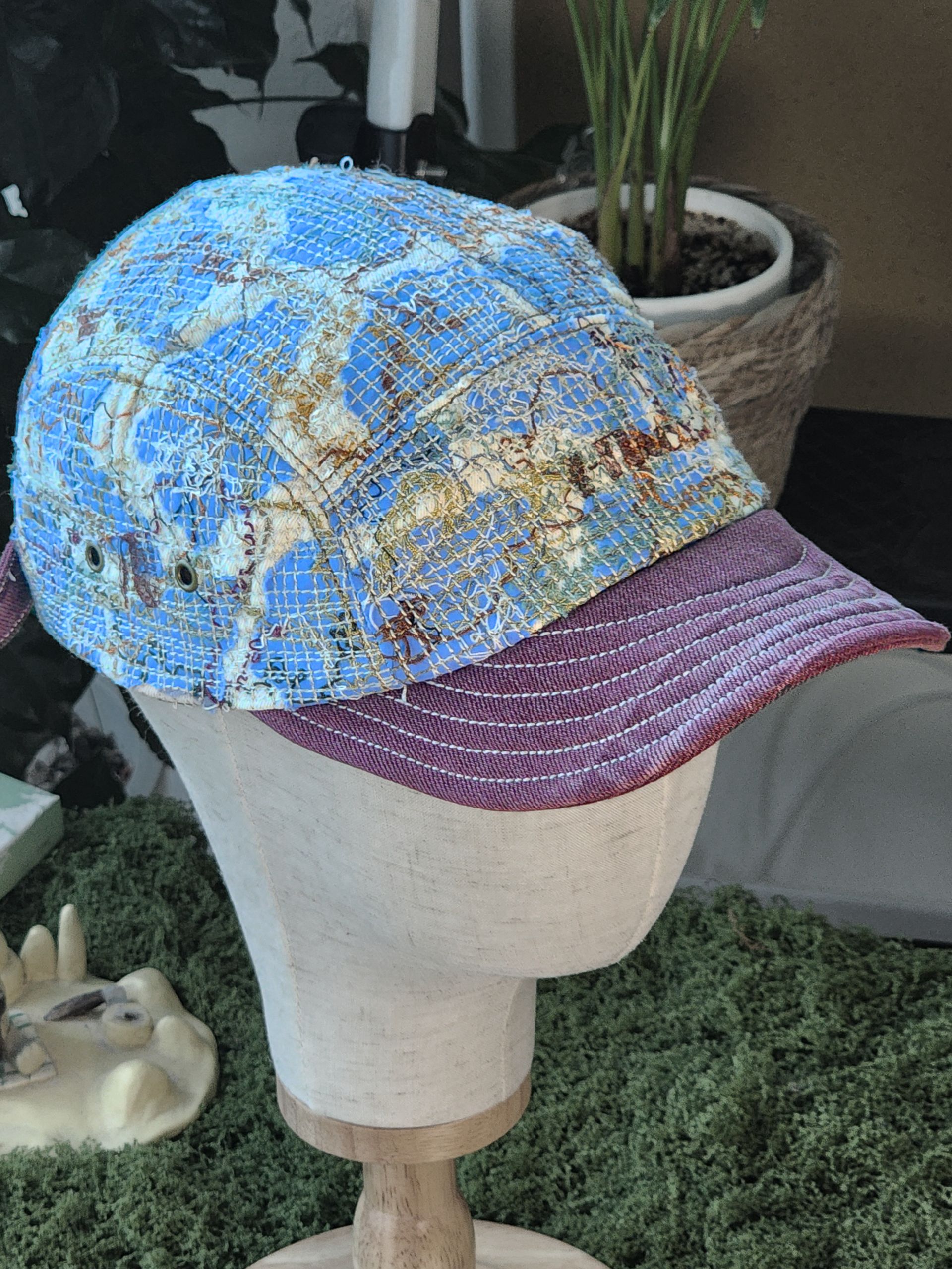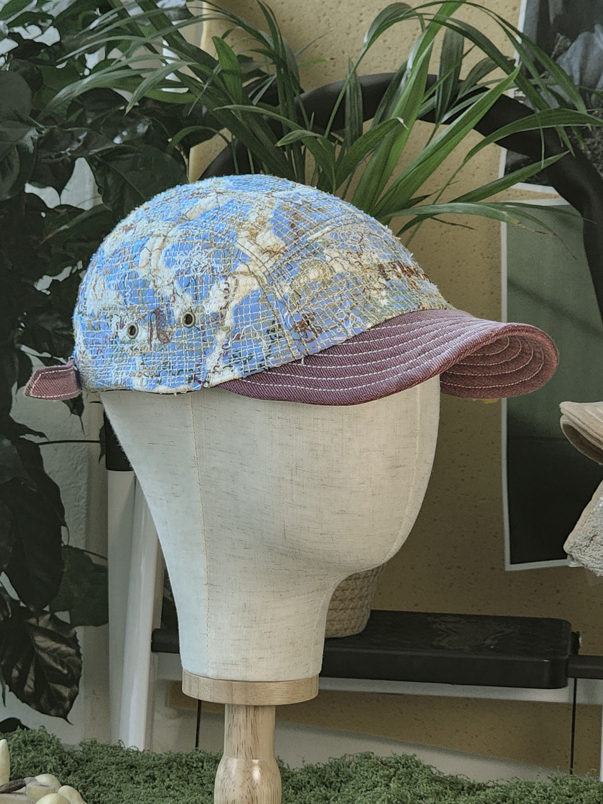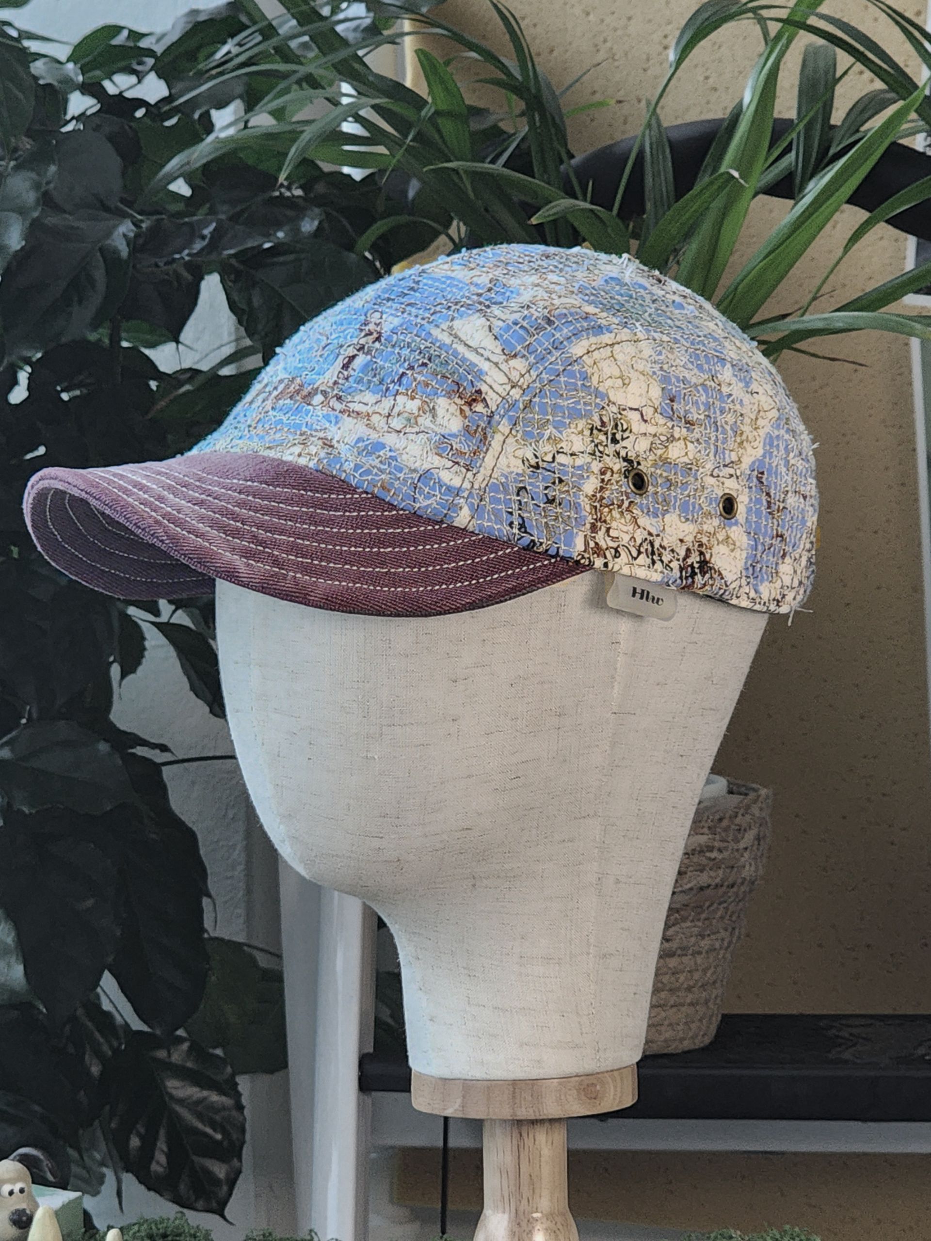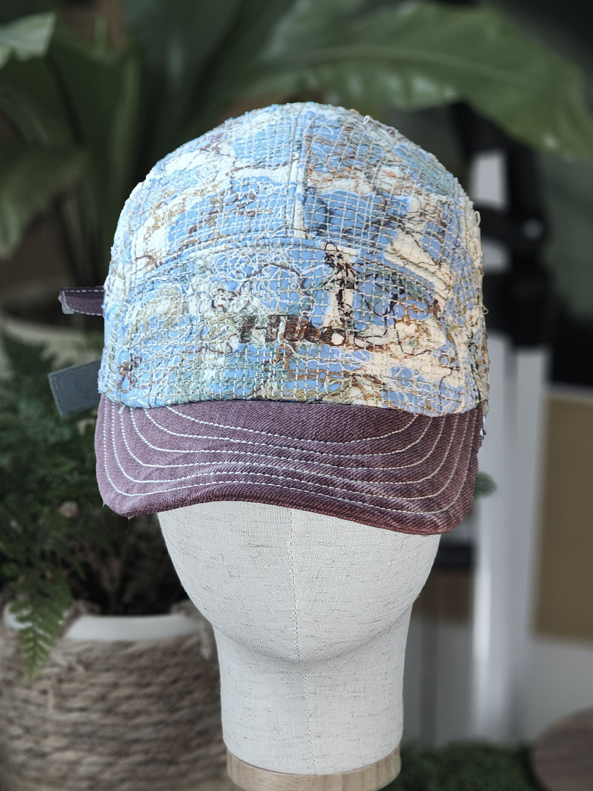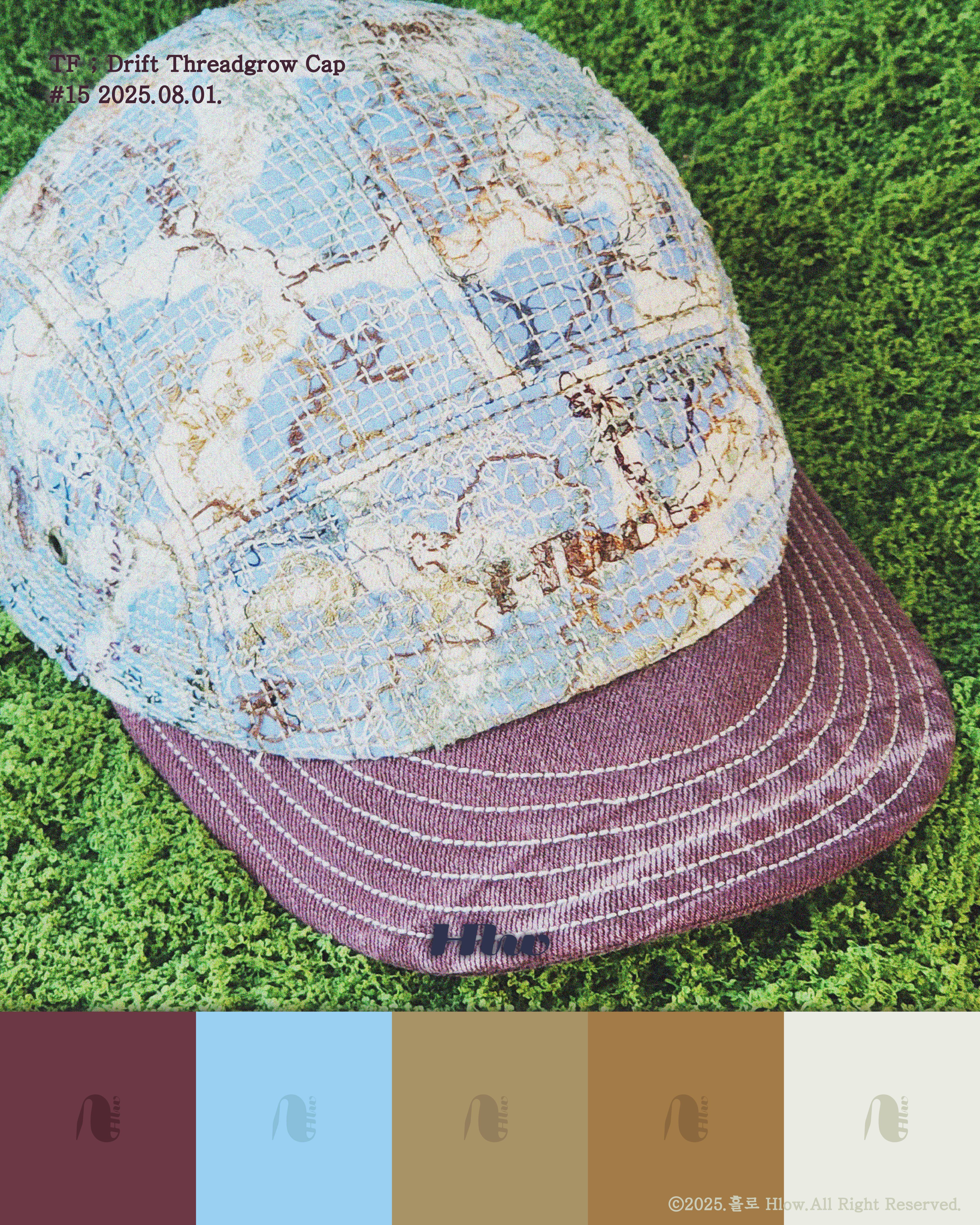 ‘TF ; Drift Threadgrow Cap’은 하늘색 천 위에 구름처럼 흩어진 텍스처와 가지를 닮은 브라운 톤의 실땀을 얹어 잎이 떠난 후의 고요함을 표현한 작업입니다.